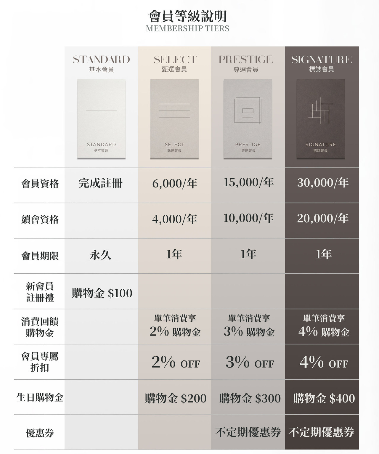 - SIGNATURE 會員:每筆消費回饋 4% 購物金